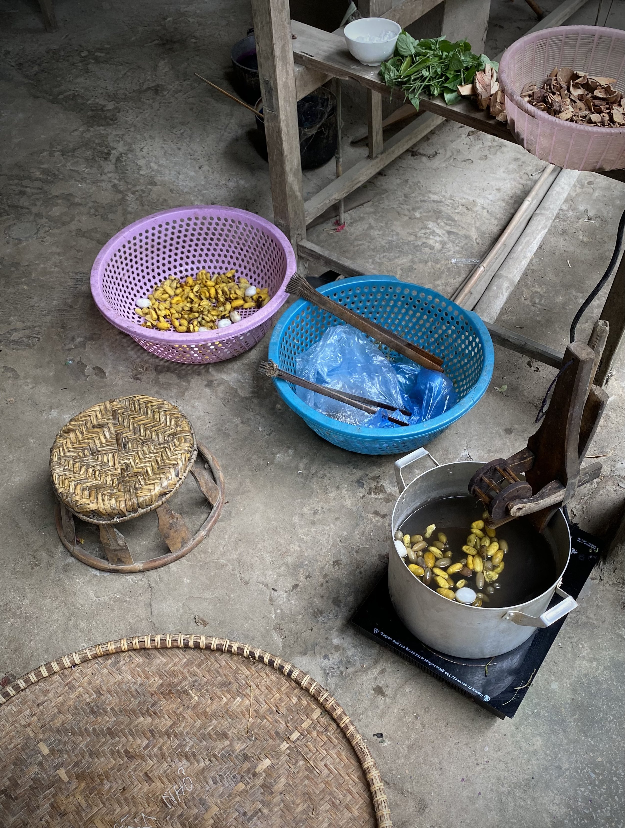 As a weaver myself, I know it’s a labour of love. Watching Ms Trang spinning silk from cocoons adds another layer of complexity and devotion to the process. We followed her through the garden set in the jungle as she navigated the land to harvest the ingredients she required to soften the woven raw silk. After collecting the items, she cut off two banana leaves, wrapped the ingredients up and tied it off with a vine creating a compact parcel she could then carry back on her scooter. She threaded a vine through the two fruits and hung them from the handlebars. I couldn’t stop smiling at how savvy and beautiful she made this task. Georgina Whigham